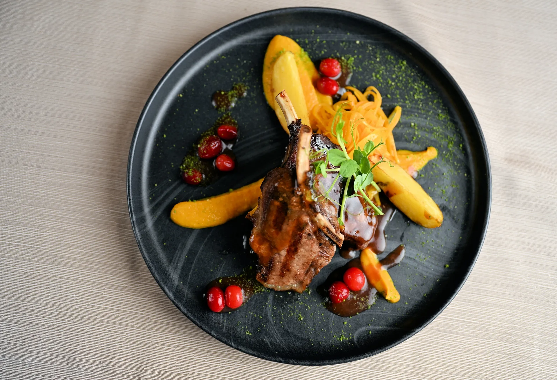 Zarebrnica mladega divjega prašiča, bučna krema, sotirana buča in ocvrt krompir