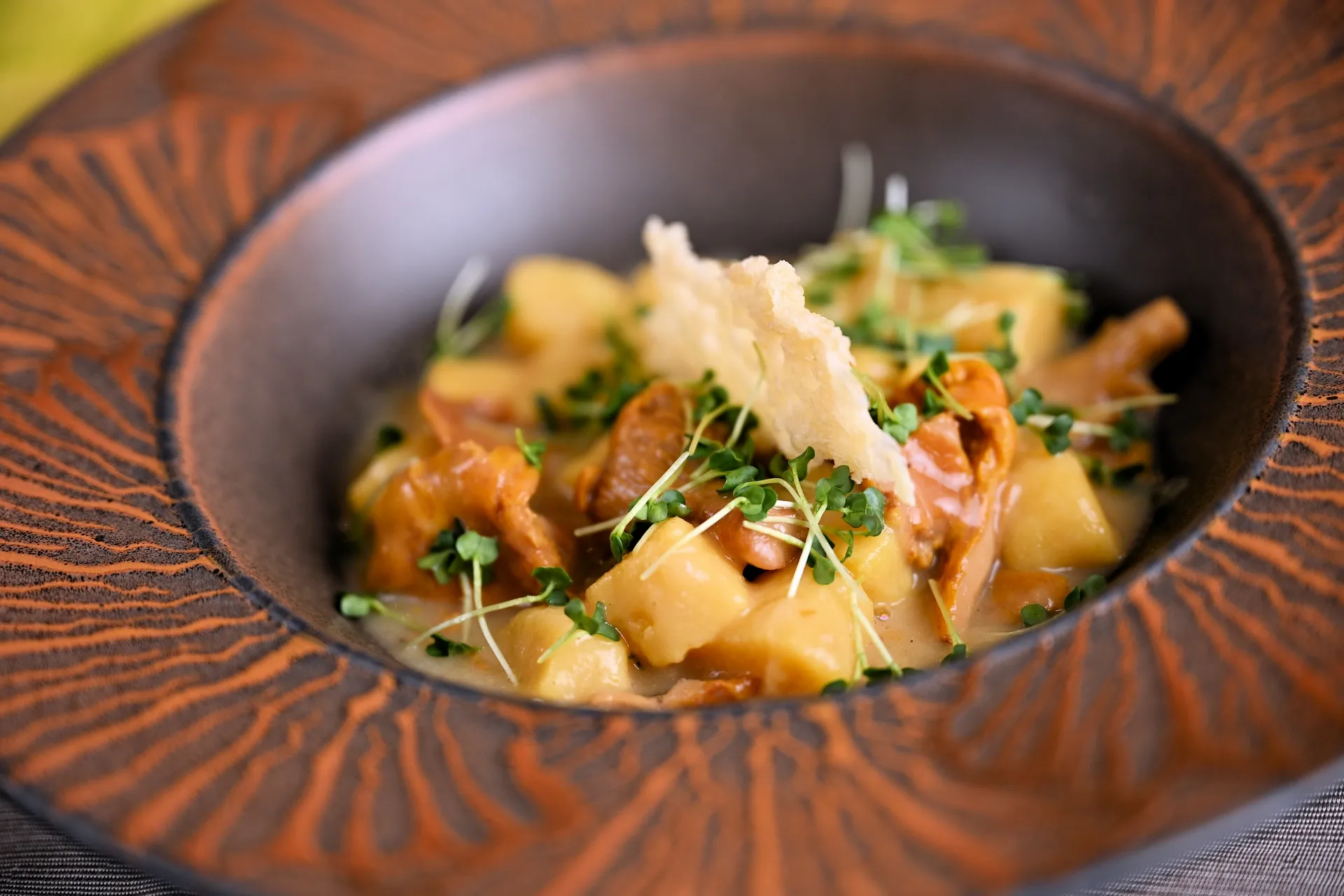 Kostanjev štrukelj z jurčkovim ragujem in svežim kozjim sirom