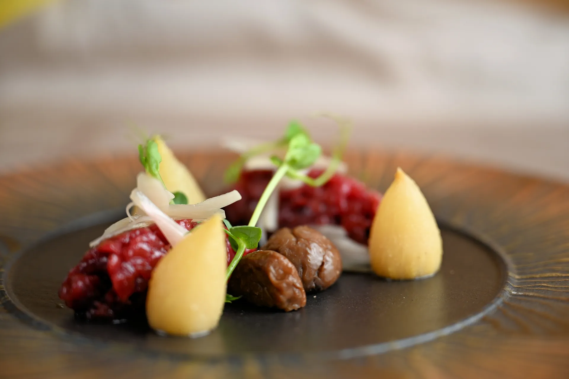 Jelenov tartar s kostanjem, vloženo šalotko in hruškami
