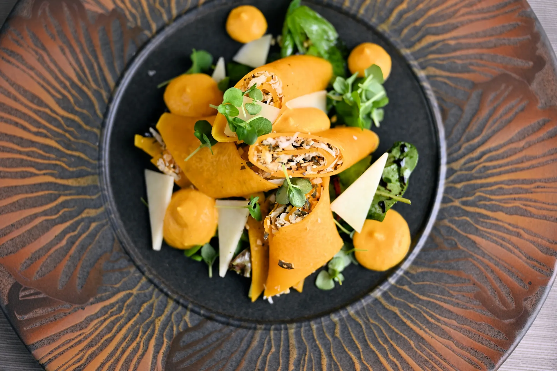 Bučna rolada, polnjena z mešanimi solatnicami in feta sirom, bučni humus s praženimi bučnimi semeni